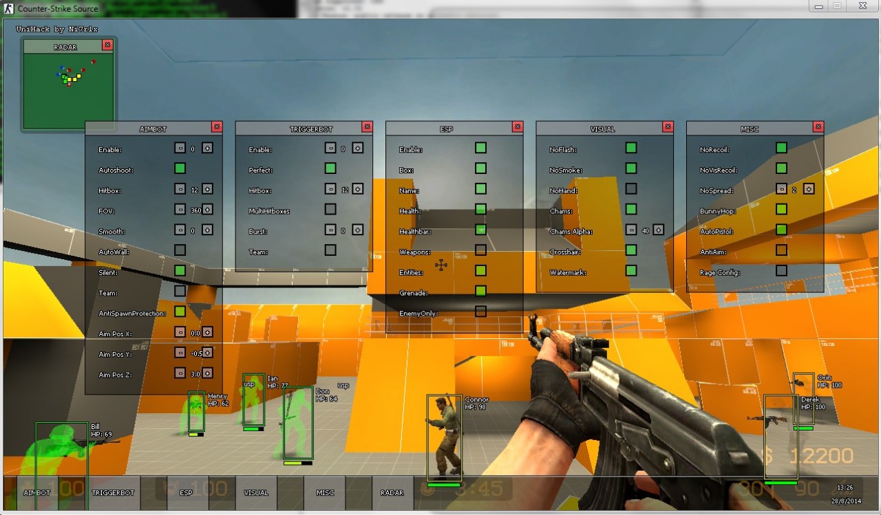 MISK: RADAR: Запуск чита: 1.Запускаем css заходим в спектры и сворачиваем cs 6.Меню чита кнопка Insert