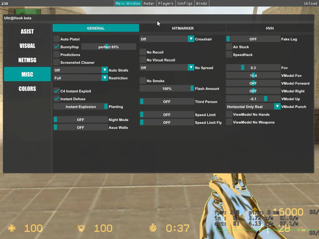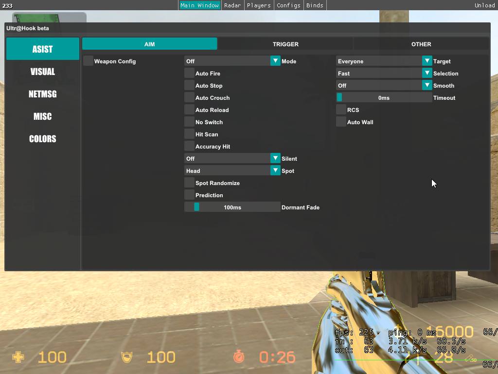 Функции Чита: Aimbot, Perfect + Chance triggerbot, BHOP (75% perfect) and other stuff is undetected on servers with SMAC, Kigens, ULTRA (ULTRA NEEDs 280units speed +50% perfect). | |