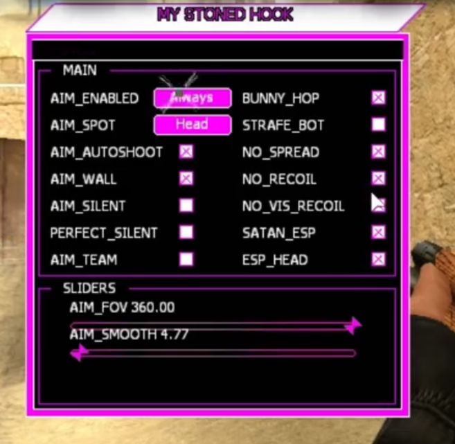 Чит stoned hook очень мощный топовый чит, в этом чите красивое оригинальное меню, каждая функция описана на английском языке. В этом чите настройка только AimBot, превосходство этого чита заключается в его стрельбе, вы можете настроить так что он сам будет нацеливаться и стрелять, можно настроить так что выстрел будет на определенную кнопку мыши, есть возможность включить No_Recoil, Psilent самые важные функции. | |